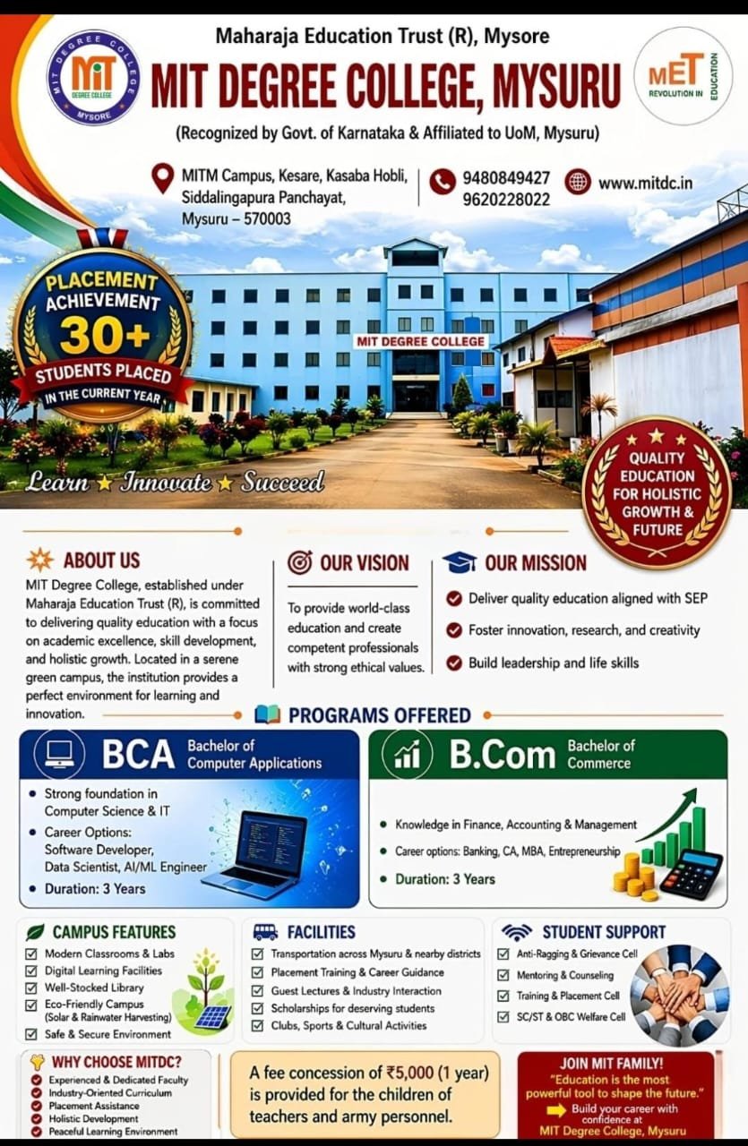 Myself Tanveer. T. I am the student of 1st sem BCA @ MIT Degree college Mysore. "In our college the teaching is very practical and the content is good. The staff are super friendly!" "The professor's engage us well and teach the theory and practical information in an effective manner. Good equipments are provided to get best results, for optimal understanding.. Thank you 🙏